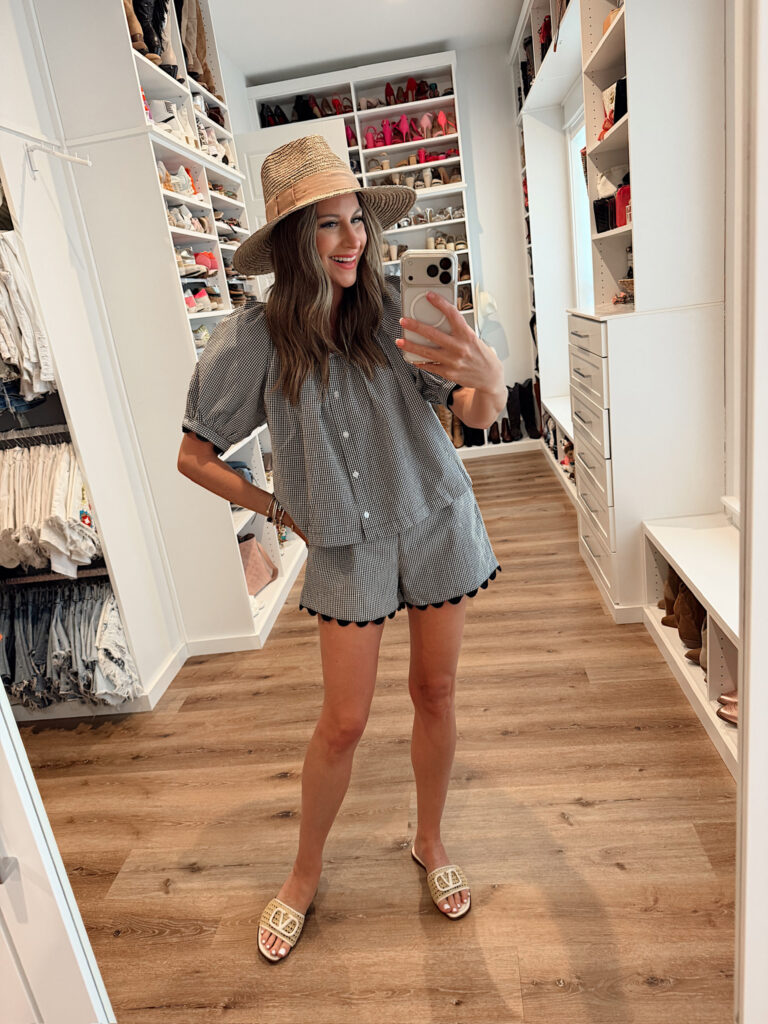 My spring mom fit! In a medium gingham workout set, medium cropped sweatshirt, sandals and accessories – fits tts. Shop the look here!