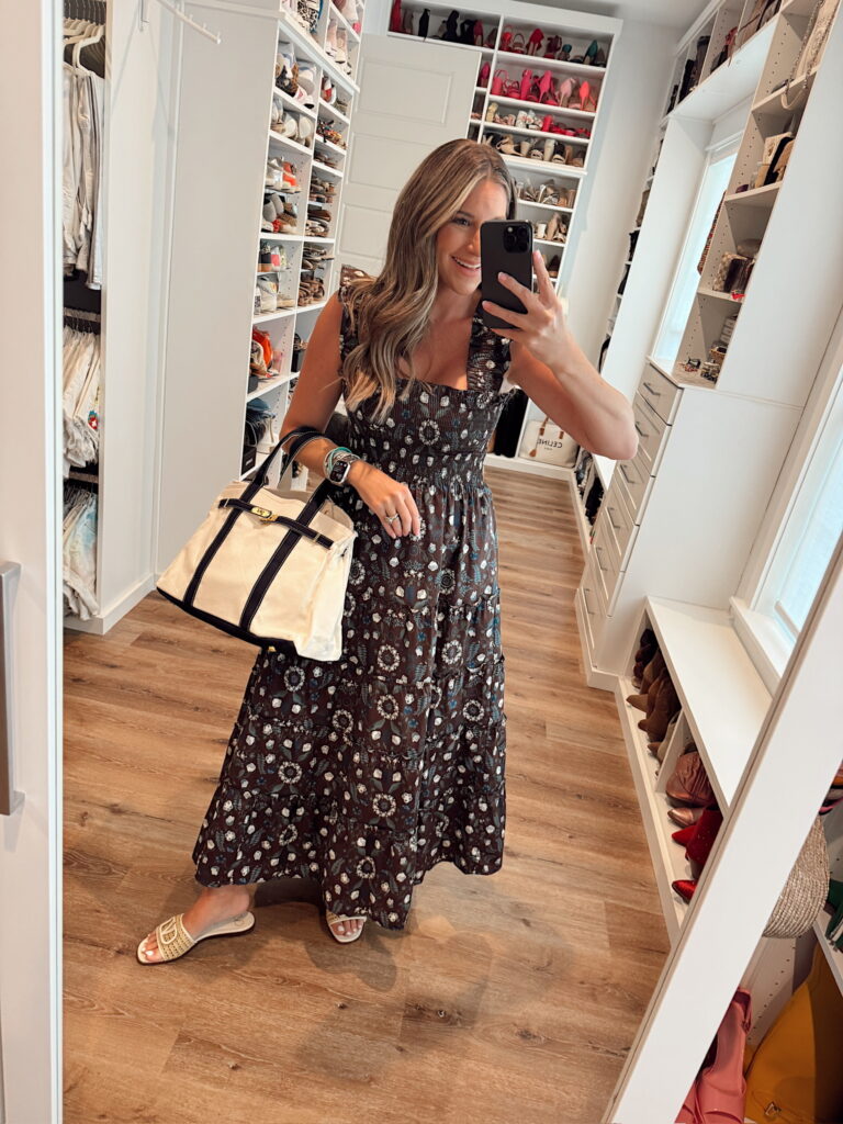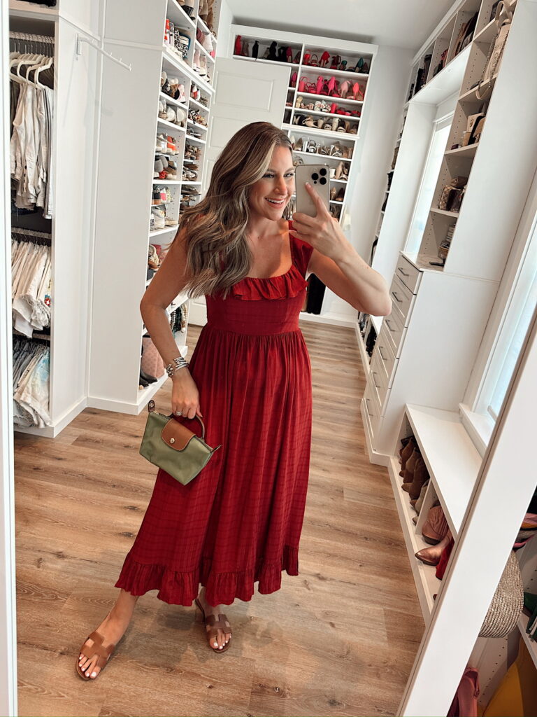 Another good dress option for a fall transition outfit! In a small Ellie nap dress, sandals and accessories- fits tts. Shop the items here!