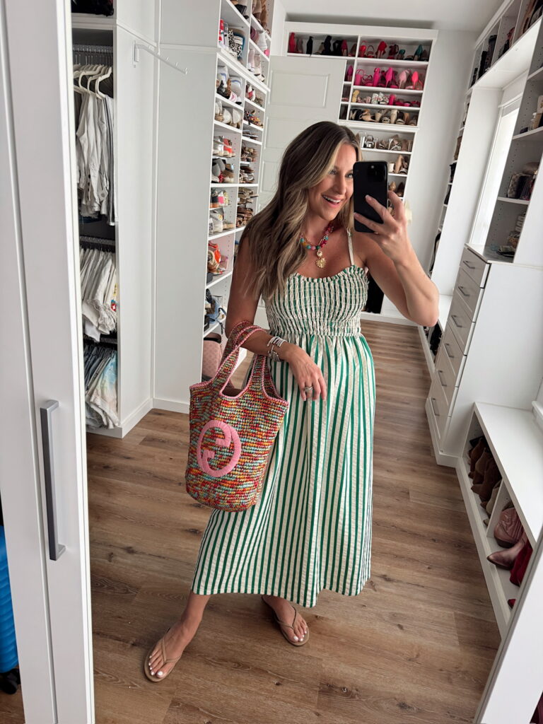 This dress is a great end of summer/early fall dress you can wear now and then style up with a jacket and boots for fall! In a medium green and white stripe smocked top maxi, necklaces, sandals and accessories – fits tts. Shop the items here!