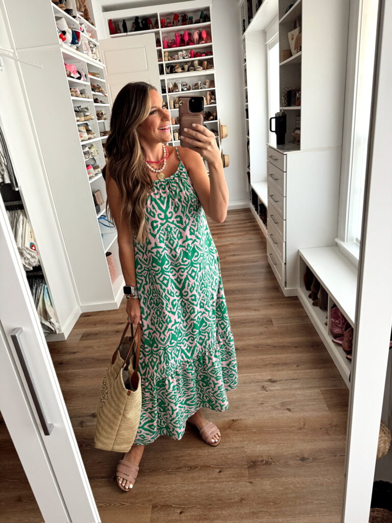 In a medium pink and green boho loose maxi, sandals, necklaces and accessories – all fits TTS.