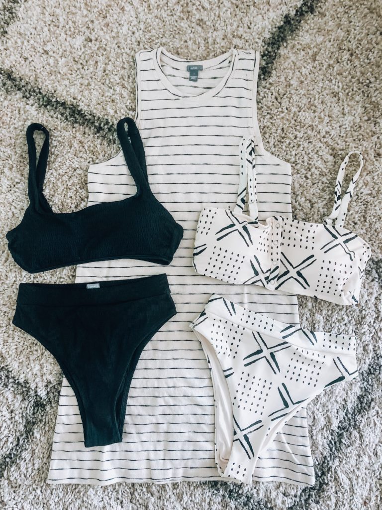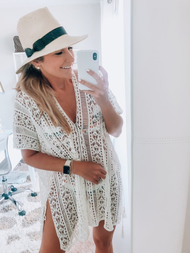 Outfit Details: Bright Pink Pom Pom Coverup (Amazon Prime for $16), Amazon Prime Straw Raffia Backpack (only $32.99), Flamingo head scarf, Lolli Swim stripe over the rainbow swimsuit (Highwaisted bottoms here, and scoop bikini top here),