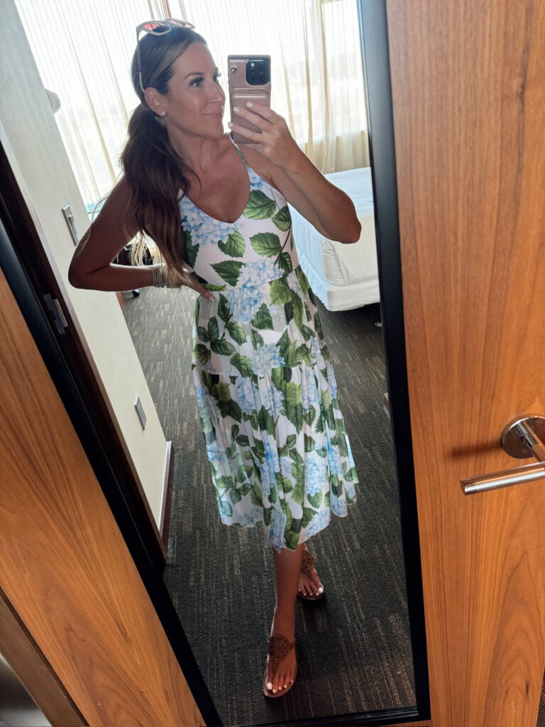 In a medium v neck coverup dress, sandals and accessories – all fits TTS.