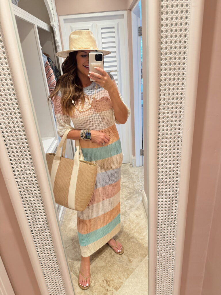 In a medium rainbow crochet maxi coverup, shell strap fedora, sandals, tote and accessories for beach resort outfit – all fits TTS.