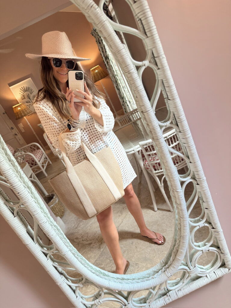 In a large coverup dress, straw bag, straw hat, sandals and accessories for beach/cruise/pool outfit – all fits TTS.
