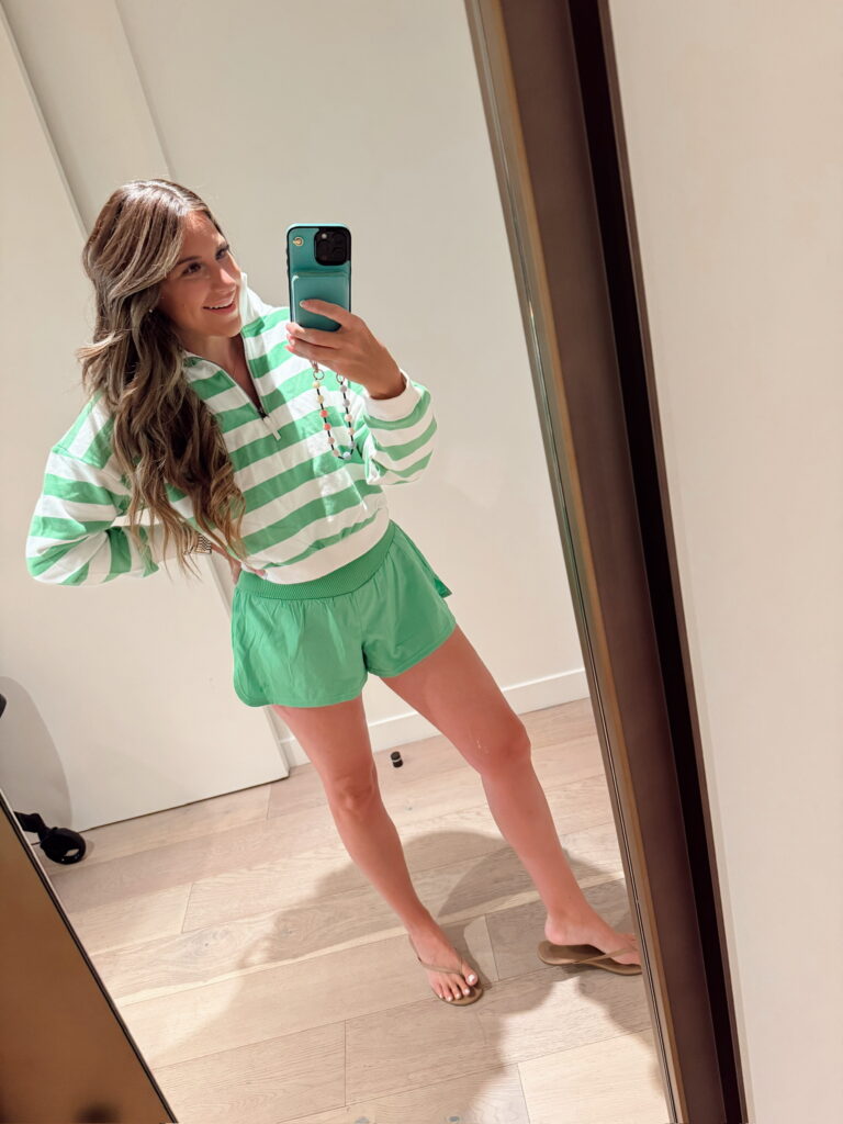 In a medium stripe 1/2 zip sweatshirt, medium active shorts, sandals and accessories- fits tts. Shop the items here!