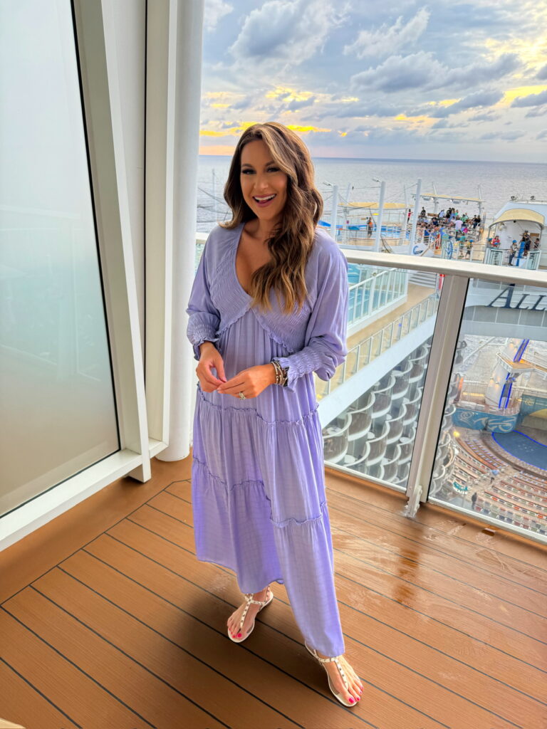 In a small v neck empire waist maxi, studded gladiator sandals and accessories for tropical/cruise – all fits TTS.