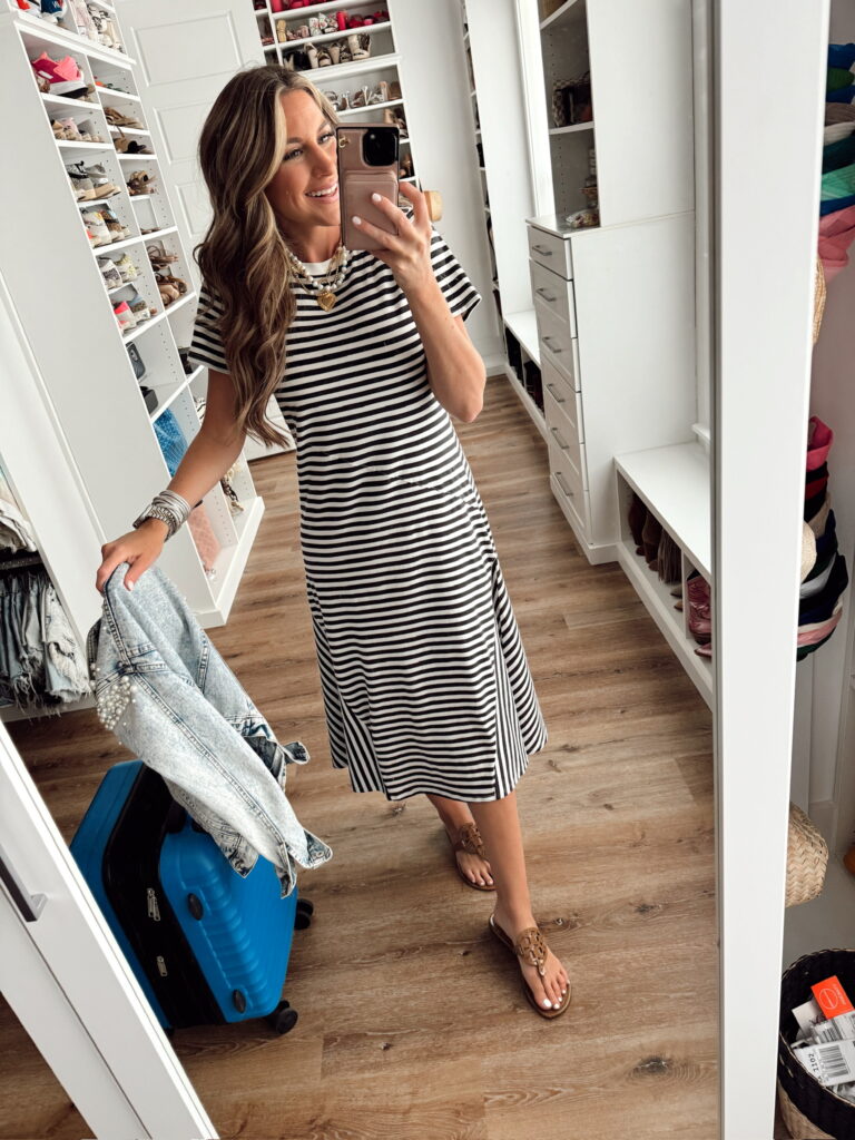 In a small stripe t-shirt midi, sandals, pearl denim jacket and accessories for travel day – all fits TTS.