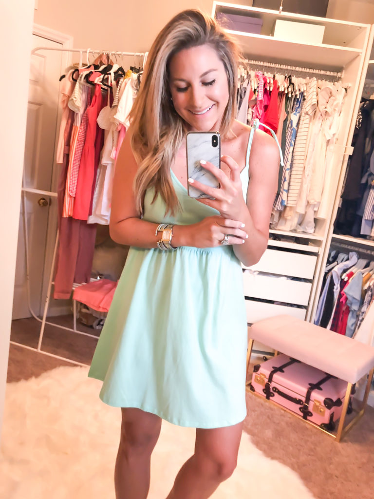 $24 Mint Green Tie Shoulder Dress (wearing size usa 6 and fits perfect) with Flamingo Clutch or straw bucket bag