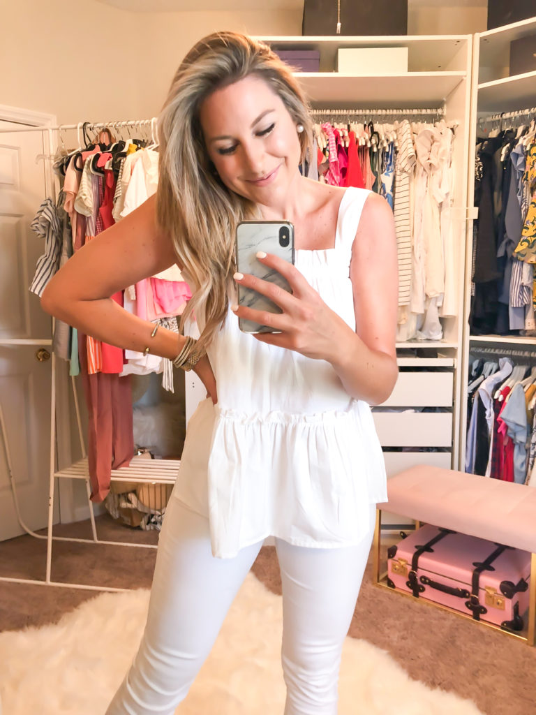 White Smock Tunic Tank (wearing a usa 6) my AE white jegging jeans (less than $50) Gingham Slides