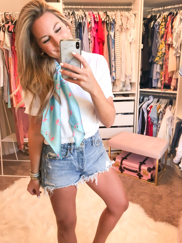 Crop tee with shirred hem and sleeve (ONLY $16 wearing size 8 for extra length) with Parker Jean Shorts and Flamingo Neck Scarf
