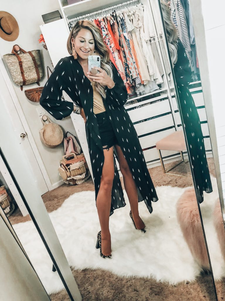 Buddy Love Duster wearing size small/medium with Parker shorts and BP Tee with leopard print heels and similar statement earrings