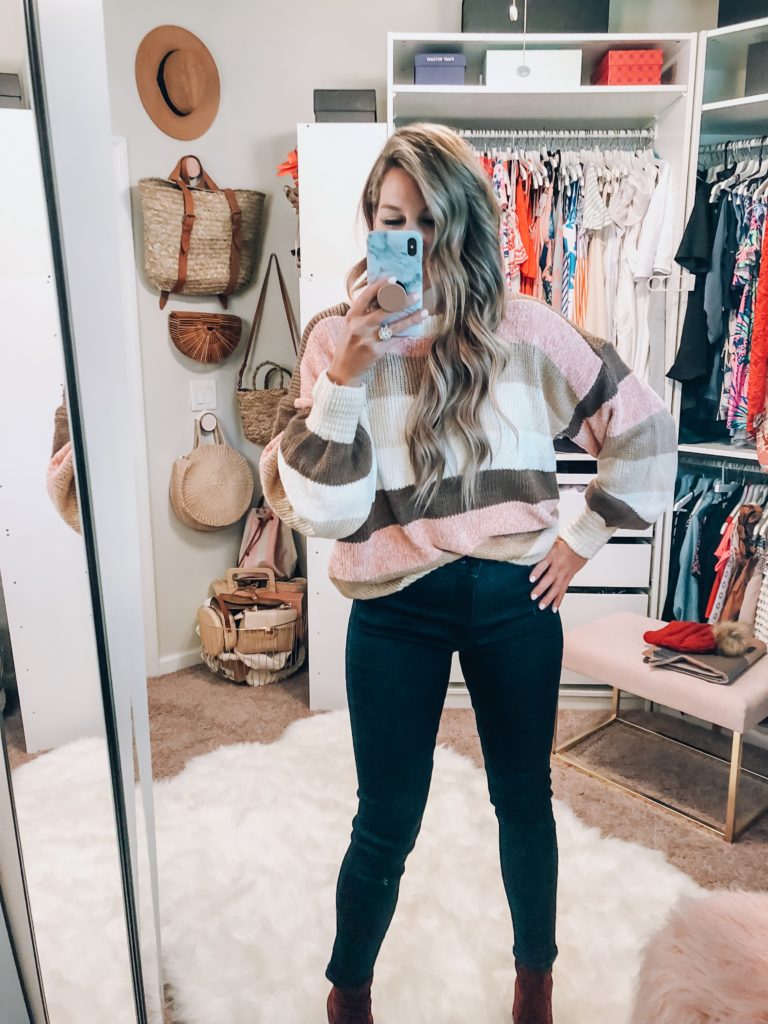 Stripe Oversized Sweater (wearing size medium for extra oversize) and Dark Wash Skinny Jeans (run true to size) Target Burgundy Boots