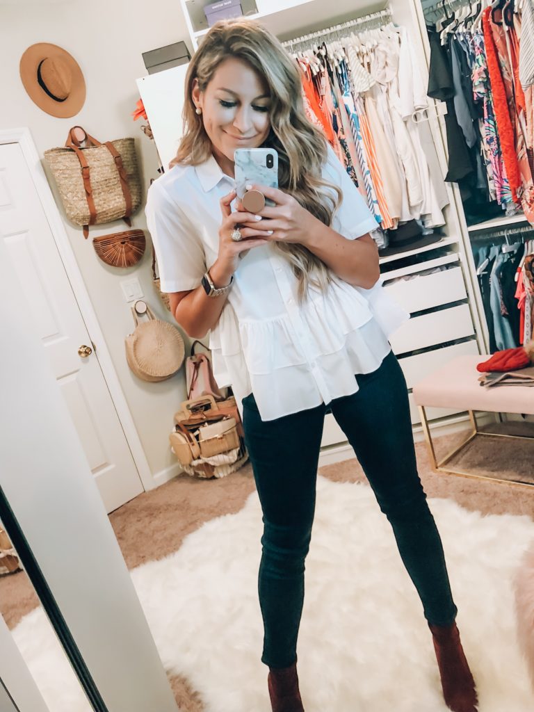 Button Up Peplum (wearing size medium, but runs true to size, do not size up like I did) and Dark Wash Skinny Jeans (run true to size) Target Burgundy Boots