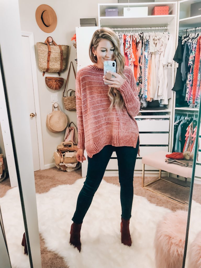 Blush Stripe Sweater (love the fit) and Dark Wash Skinny Jeans (run true to size) Target Burgundy Boots
