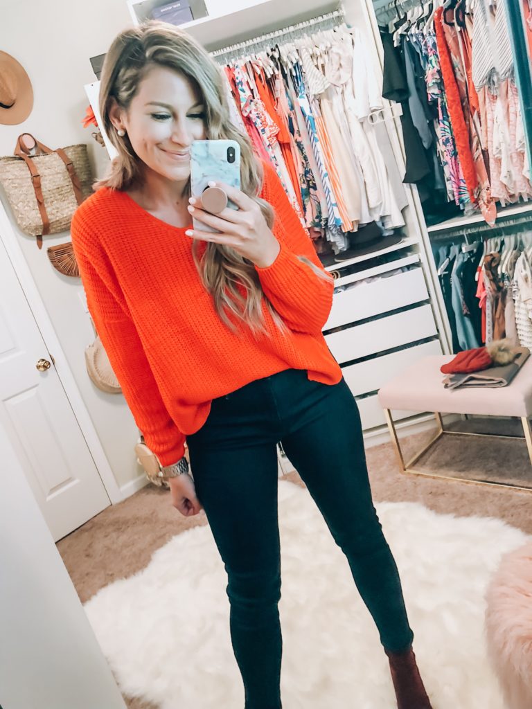 Tomato Sweater (wearing a size S/M) and Dark Wash Skinny Jeans (run true to size) Target Burgundy Boots