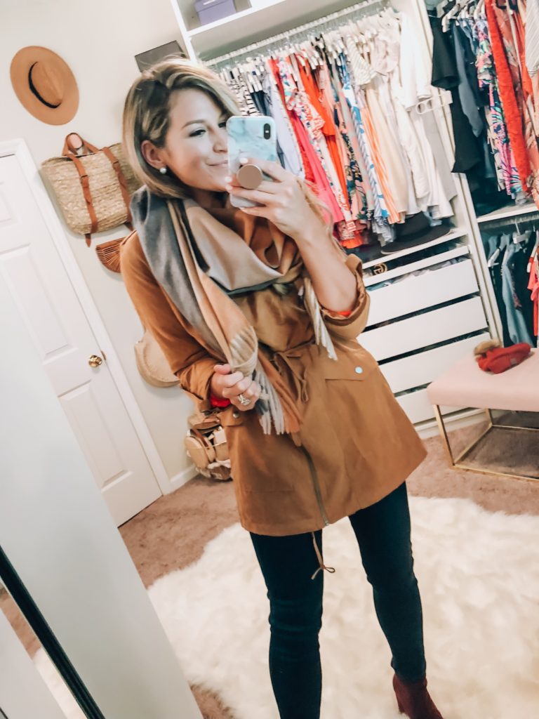 Camel Jacket (wearing the size medium, runs true to size, get true size, do not need to size up) with Plaid Scarf and Dark Wash Skinny Jeans (run true to size) Target Burgundy Boots
