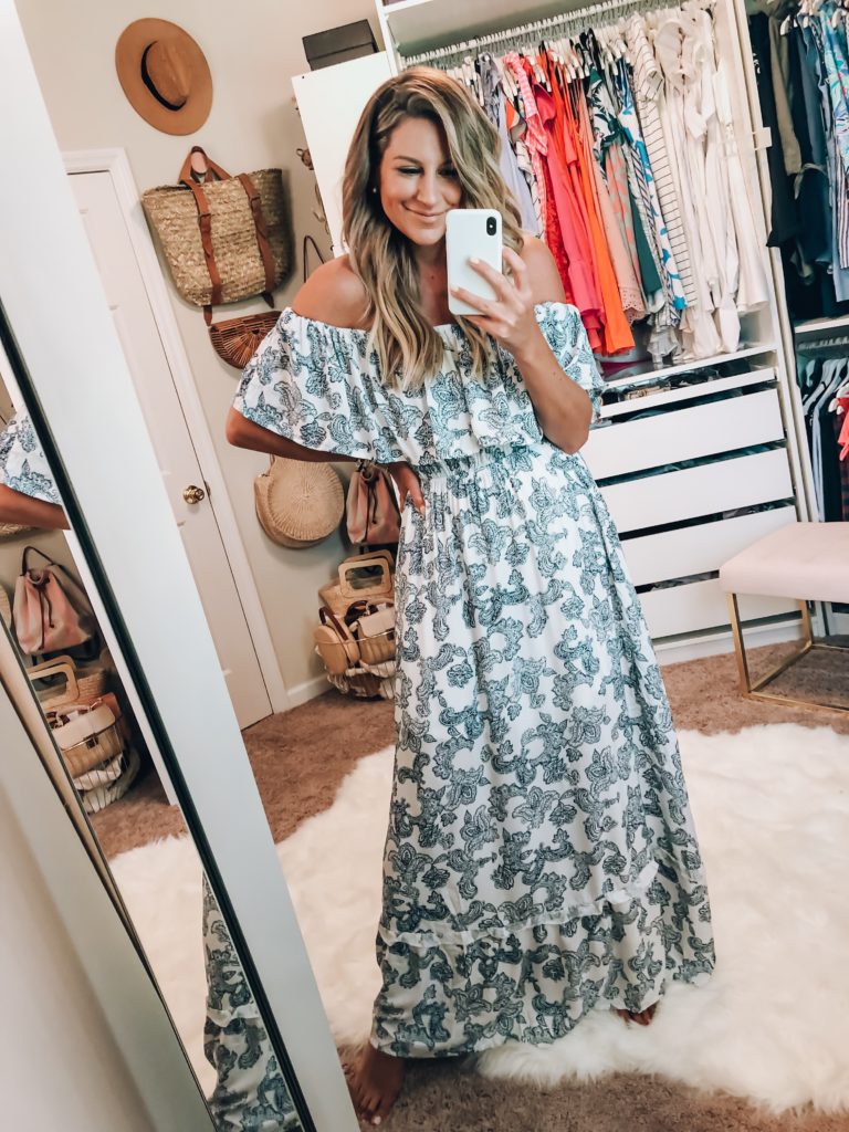 Blue white off shoulder printed maxi dress (wearing size small, $48)