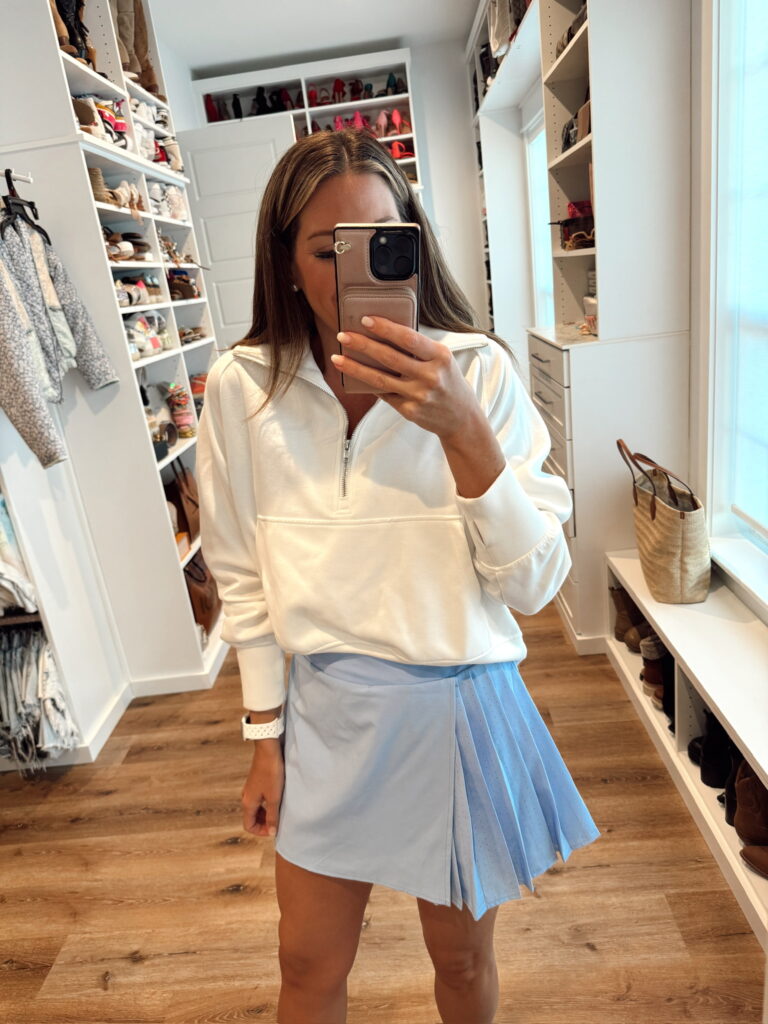 In a medium pullover cropped sweatshirt, small workout top, small pleated skort and accessories for spring – all fits TTS.