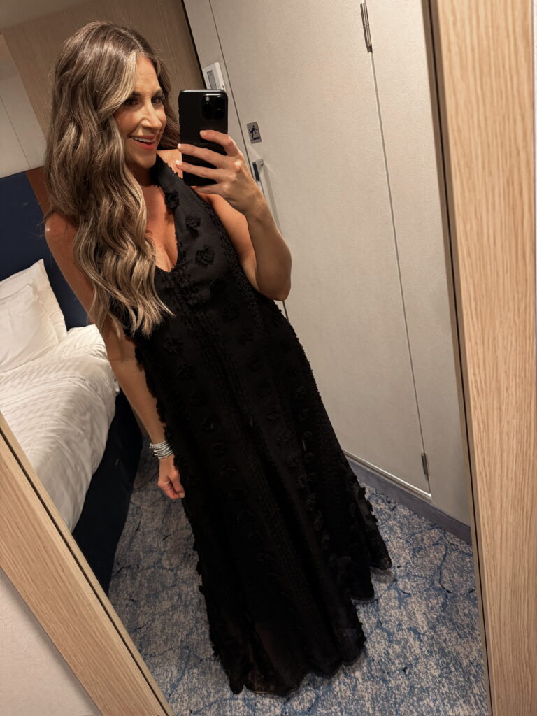 In a medium deep v 3d flower maxi, sandals and accessories – all fits TTS.