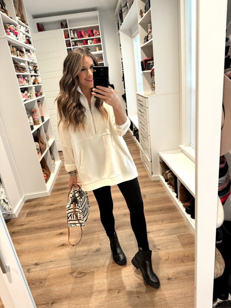 In a medium half zip sweatshirt, small leggings, boots and accessories for winter outfit – all fits TTS.