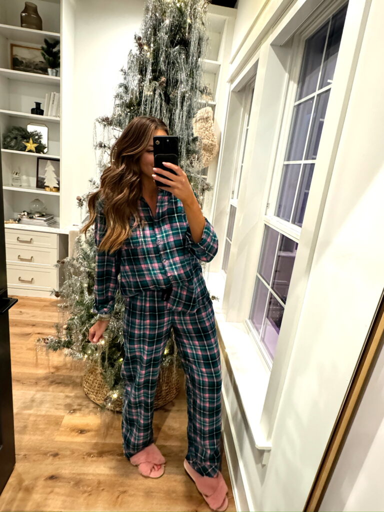 In a medium flannel pajama set, pink slippers and accessories for winter loungewear – all fits TTS.