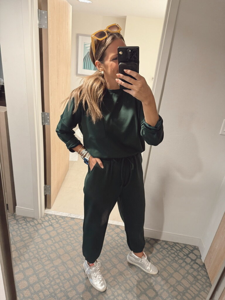In a large green 2 piece set with sweatshirt and sweatpants, gg sneakers, sunglasses and accessories for holiday/winter loungewear – all fits TTS.