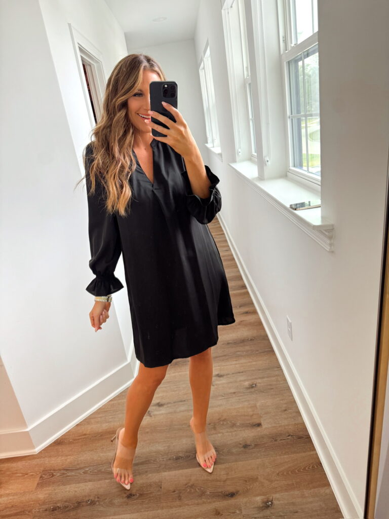 In a small black long sleeve dress, clear heels and accessories for winter outfit – all fits TTS.