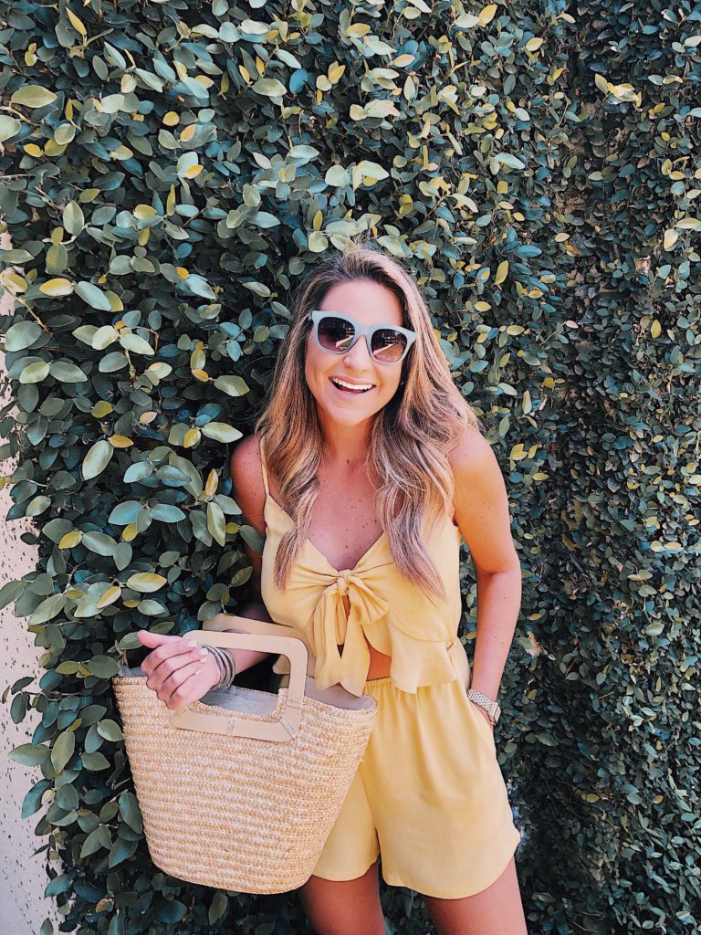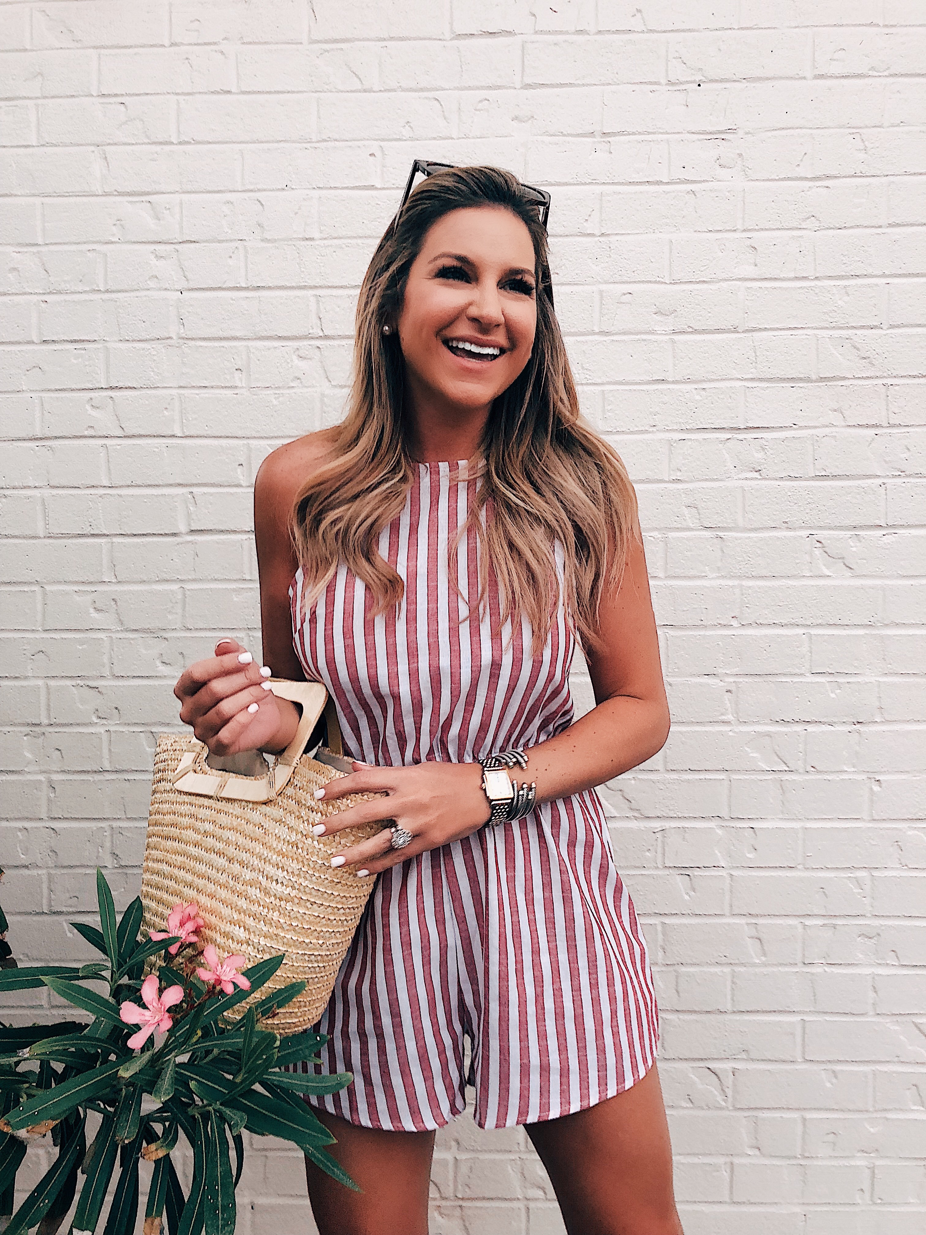 Outfit Details: Stripe Romper (wearing size medium and fits a little loose) with tassel tote, the best strapless bandeau bra, with Canvas Wedges, my favorite self tanning product, Pearl earrings, curling iron.