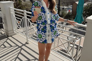 In a medium guava gingham active dress, large sweatshirt, sandals and accessories – fits tts. Shop the items here!
