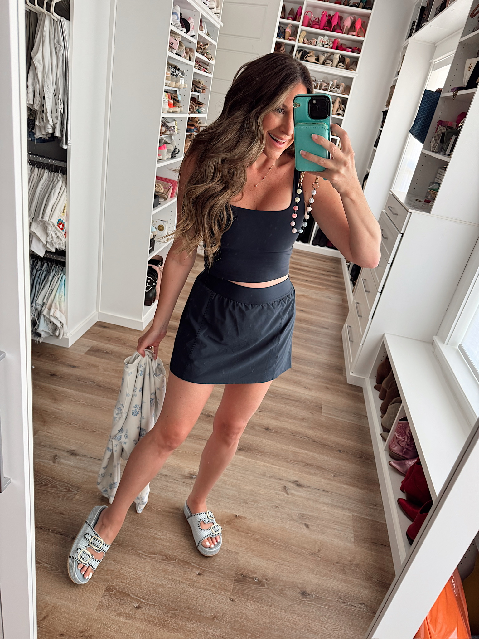 In a medium cropped active tank, medium active skirt, raffia slides and accessories- fits tts. Shop the items here!