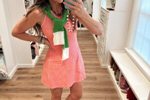 In a medium gingham active dress, hat, sneakers and accessories – fits tts. Storm’s stroller and accessories linked! Shop the items here!