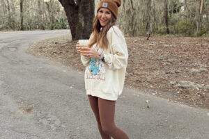 In a medium quilted pullover, medium tee, small leggings, smokey the bear hat, ankle boots and accessories for casual camping outfit – all fits TTS.