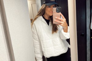 In a medium quilted pullover, medium tee, small leggings, smokey the bear hat, ankle boots and accessories for casual camping outfit – all fits TTS.