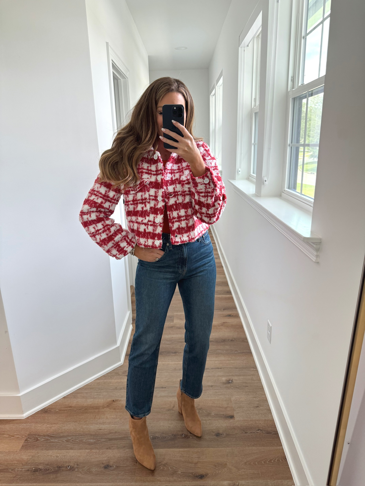 In a small red bodysuit, small sequin football shacket, size 28 jeans, ankle boots and accessories for winter – all fits TTS.