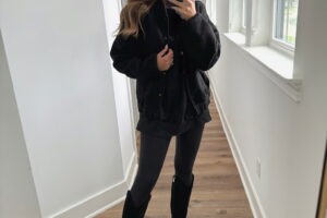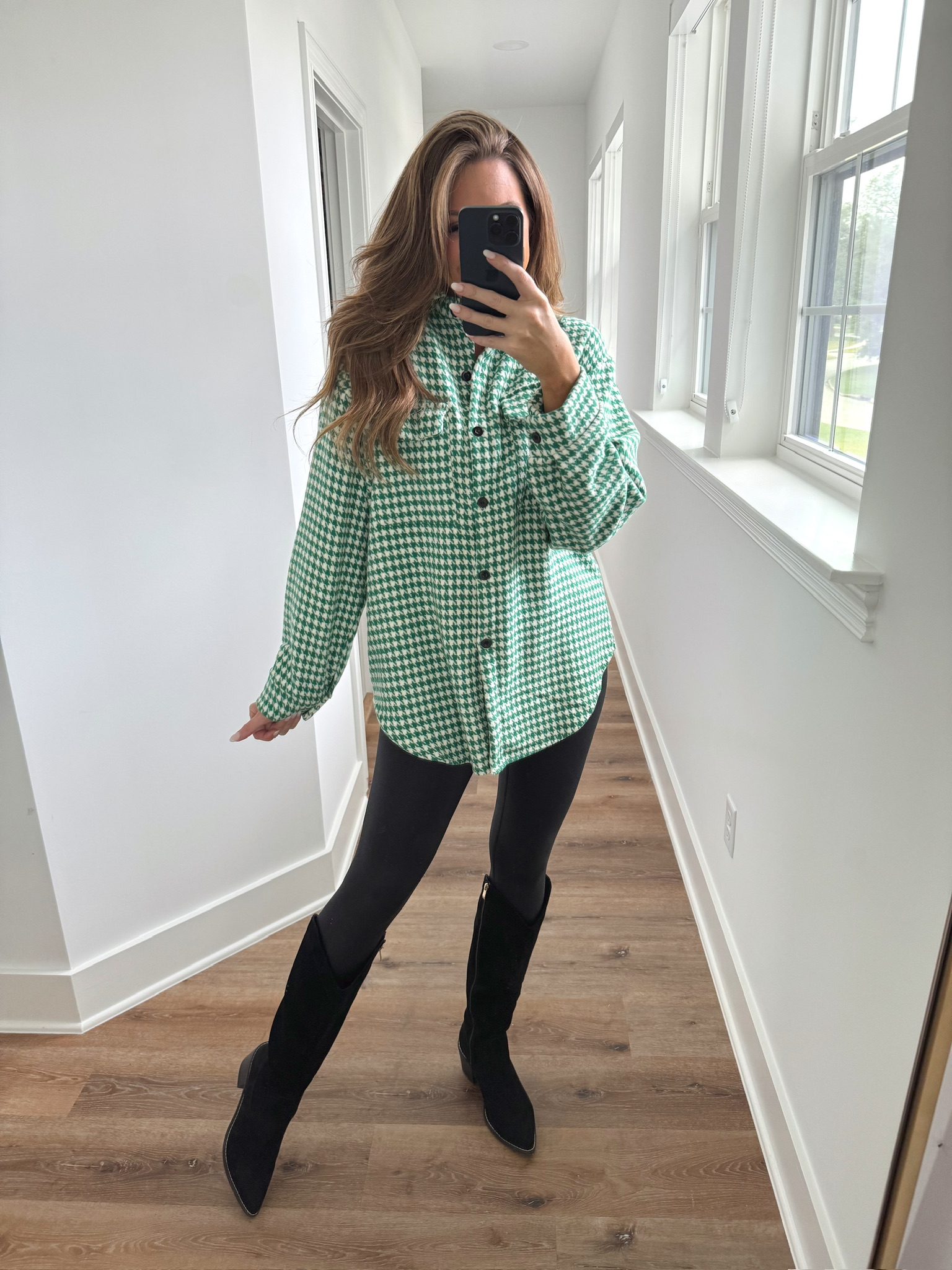 In a medium green and white houndstooth shacket, medium faux leather leggings, boots and accessories for winter – all fits TTS.