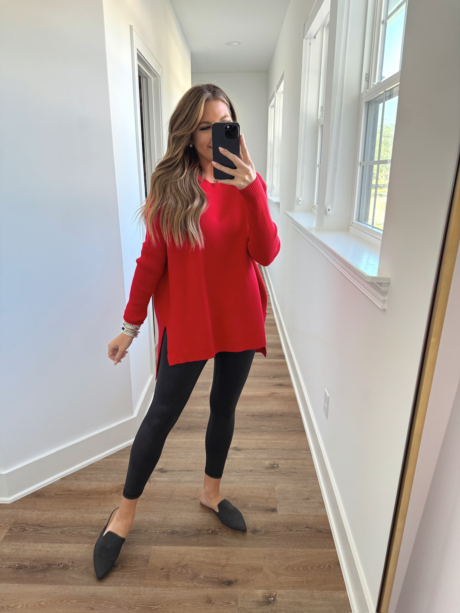 In a medium red tunic sweater, small leggings, mules and accessories for comfy winter look – all fits TTS.