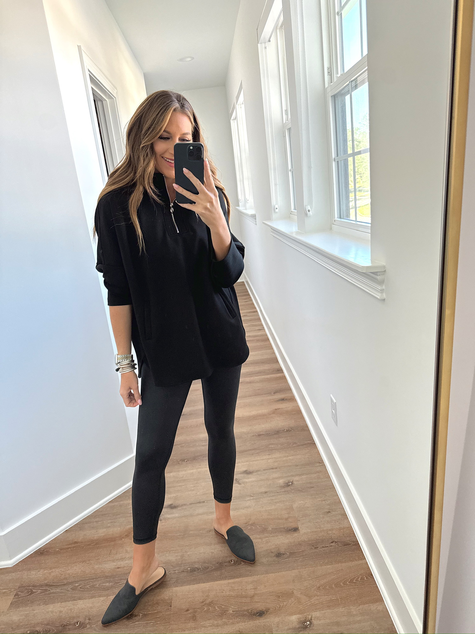 In a medium black sweatshirt, small leggings, mules and accessories for comfy winter look – all fits TTS.