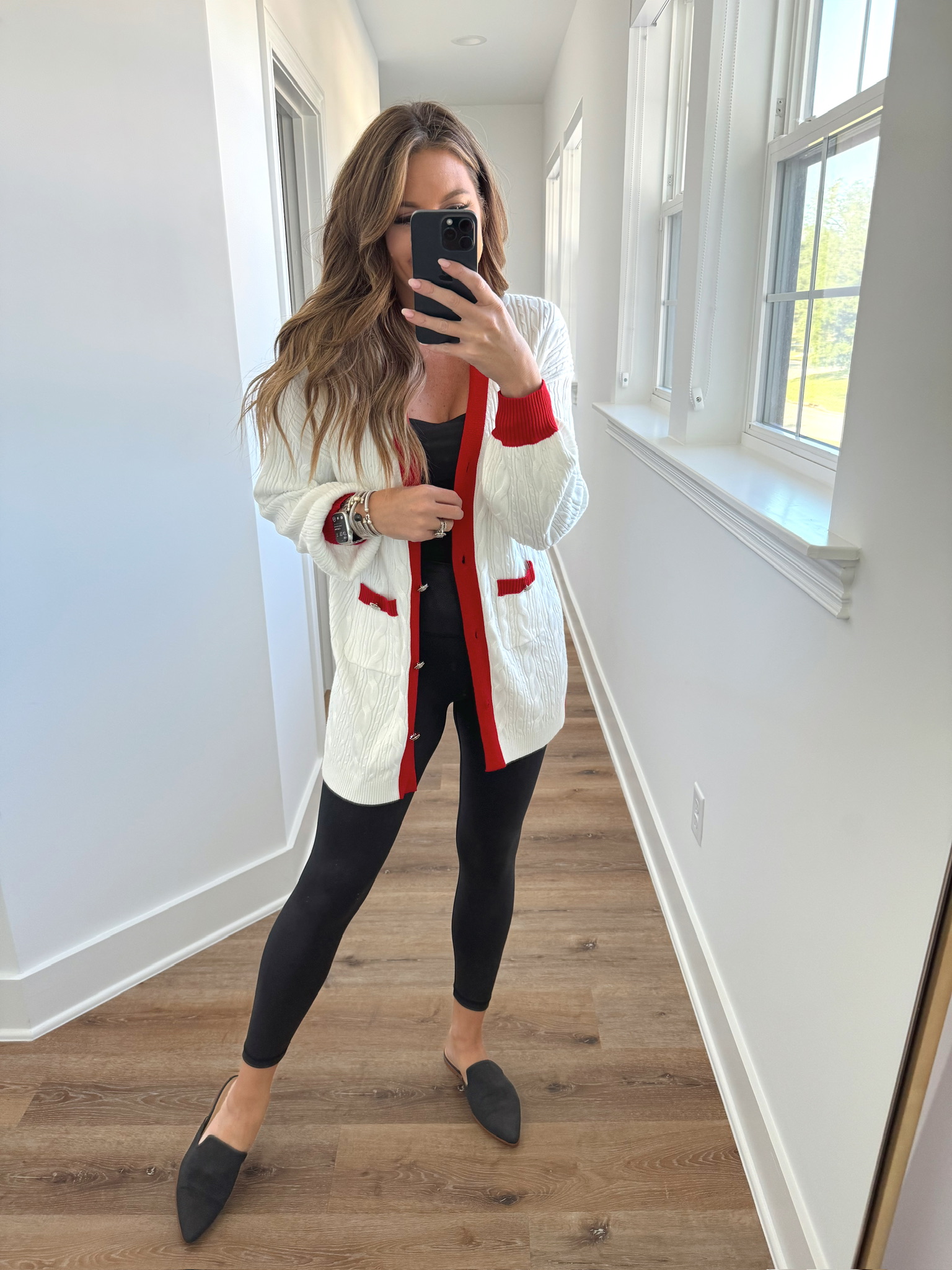 In a medium black top, medium red and white cardigan, small leggings, mules and accessories for comfy winter look – all fits TTS.
