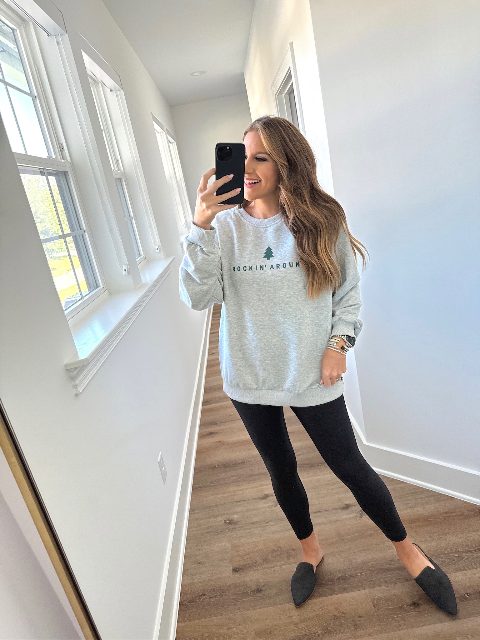In a large christmas tree sweatshirt, small leggings, mules and accessories for comfy winter look – all fits TTS.