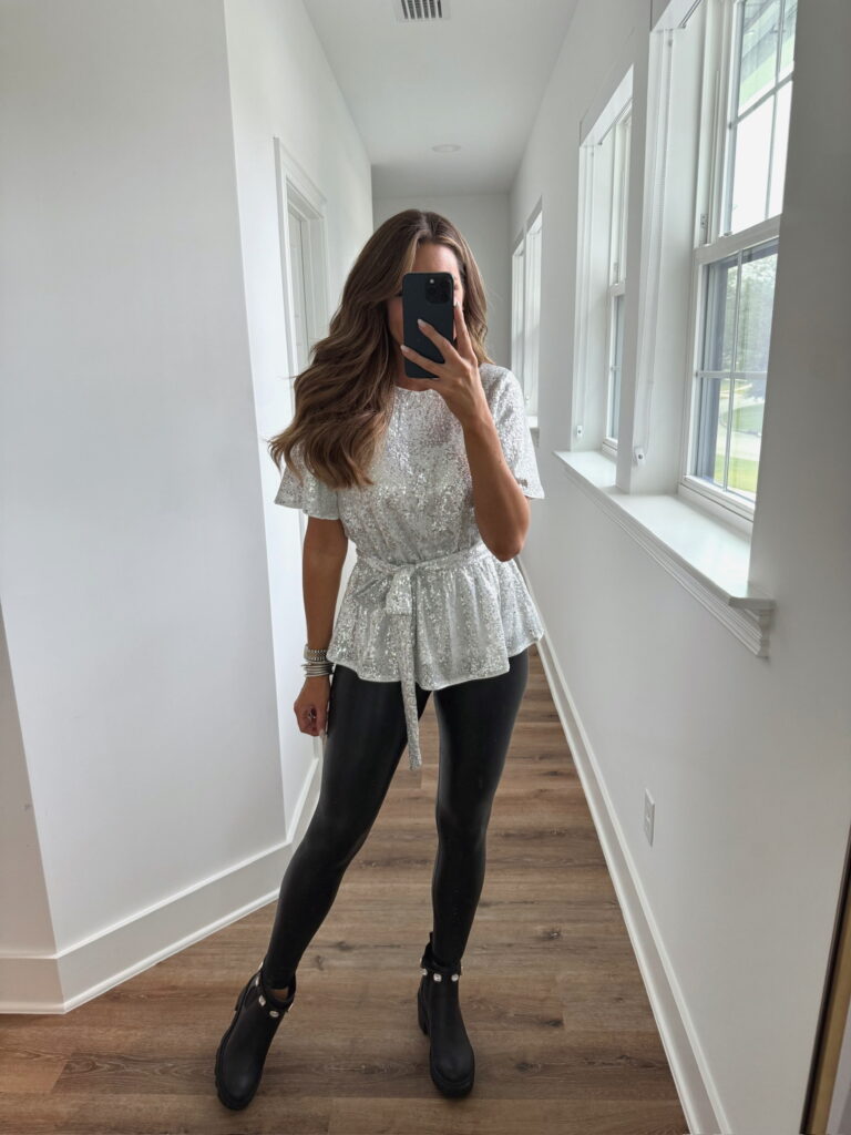 In a small faux leather dress, medium mesh long sleeve top, ankle boots and accessories for fall – all fits TTS.