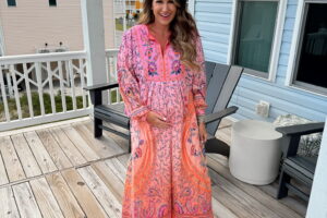 In a small maternity tennis dress, medium denim jacket with star detail and accessories- all fits TTS.
