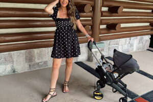 In a small puff sleeve midi dress from Abercrombie, sandals and accessories – fits tts. Shop the items here!