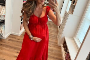 In a medium drop waist ruffle bottom dress, crystal mesh ballet flats and accessories – all fits TTS.