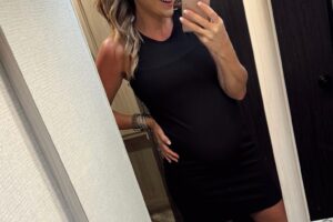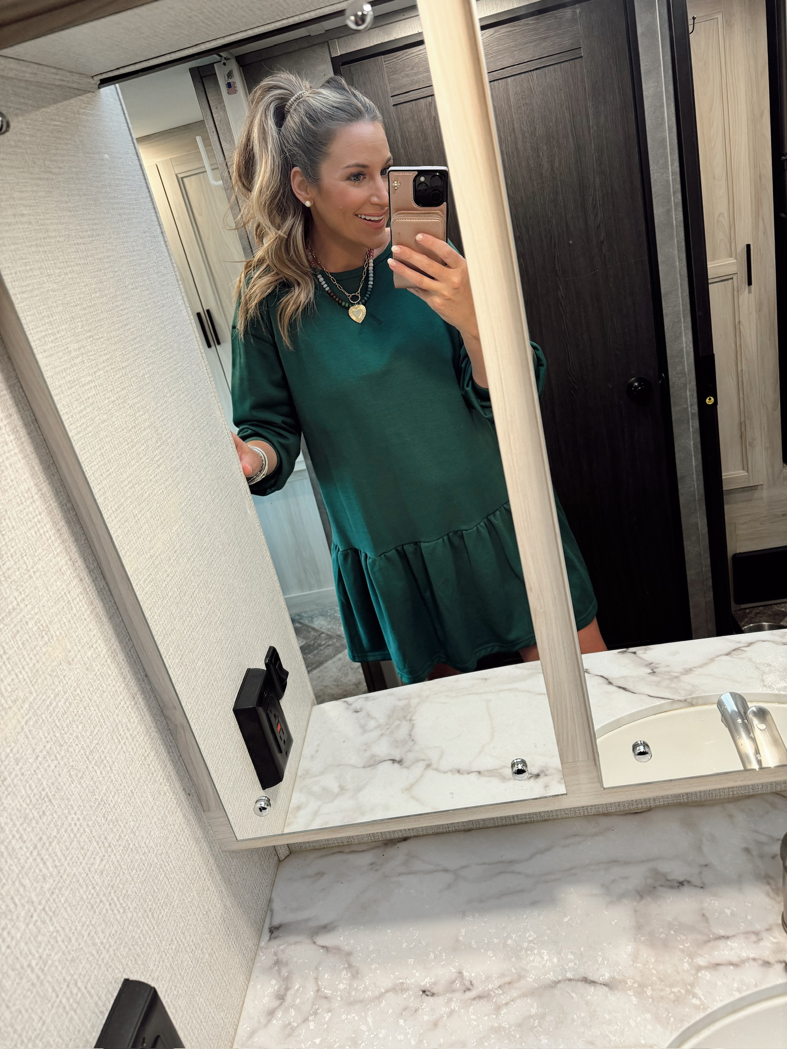 In a medium drop waist sweatshirt dress, necklaces and accessories – all fits TTS.
