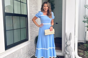 In a small v neck floral dress, hat, tie up espadrille wedges, straw tote and accessories for spring/Easter – all fits TTS.