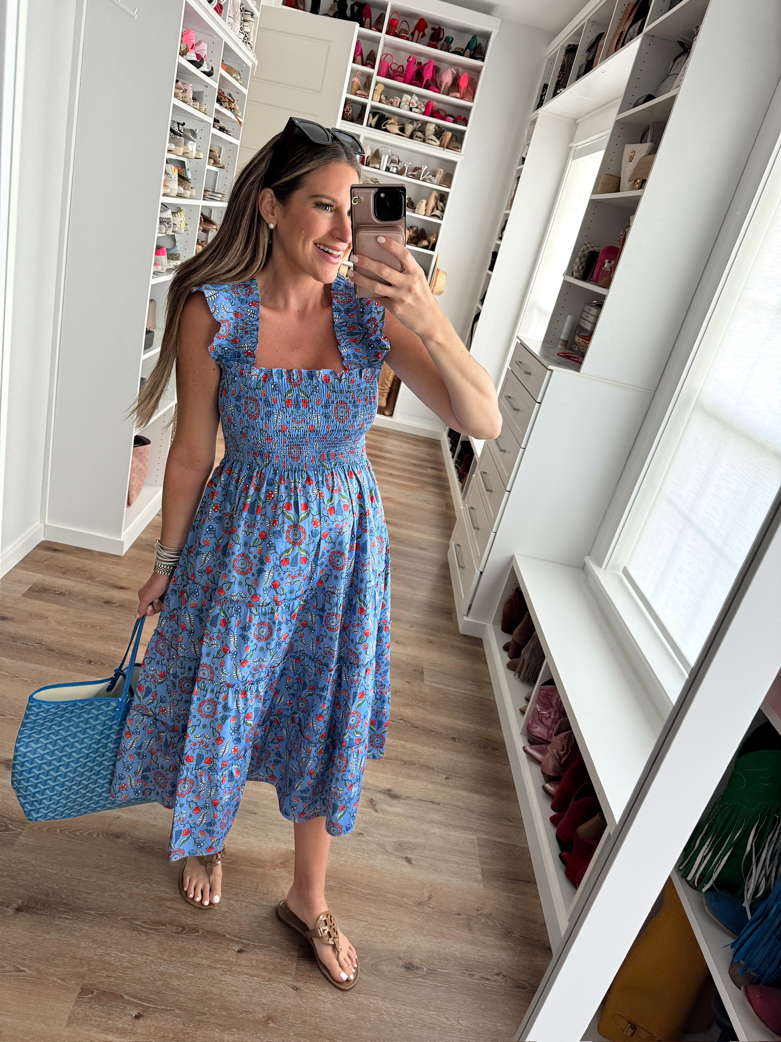 In a small smocked top midi dress, sunglasses, sandals and accessories – all fits TTS.