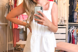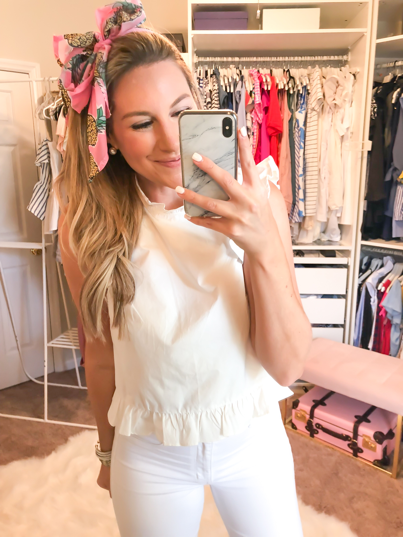 Frill Ruffle Blouse (wearing a size Small) my AE white jegging jeans (less than $50) and Pineapple Scarf (only $9)