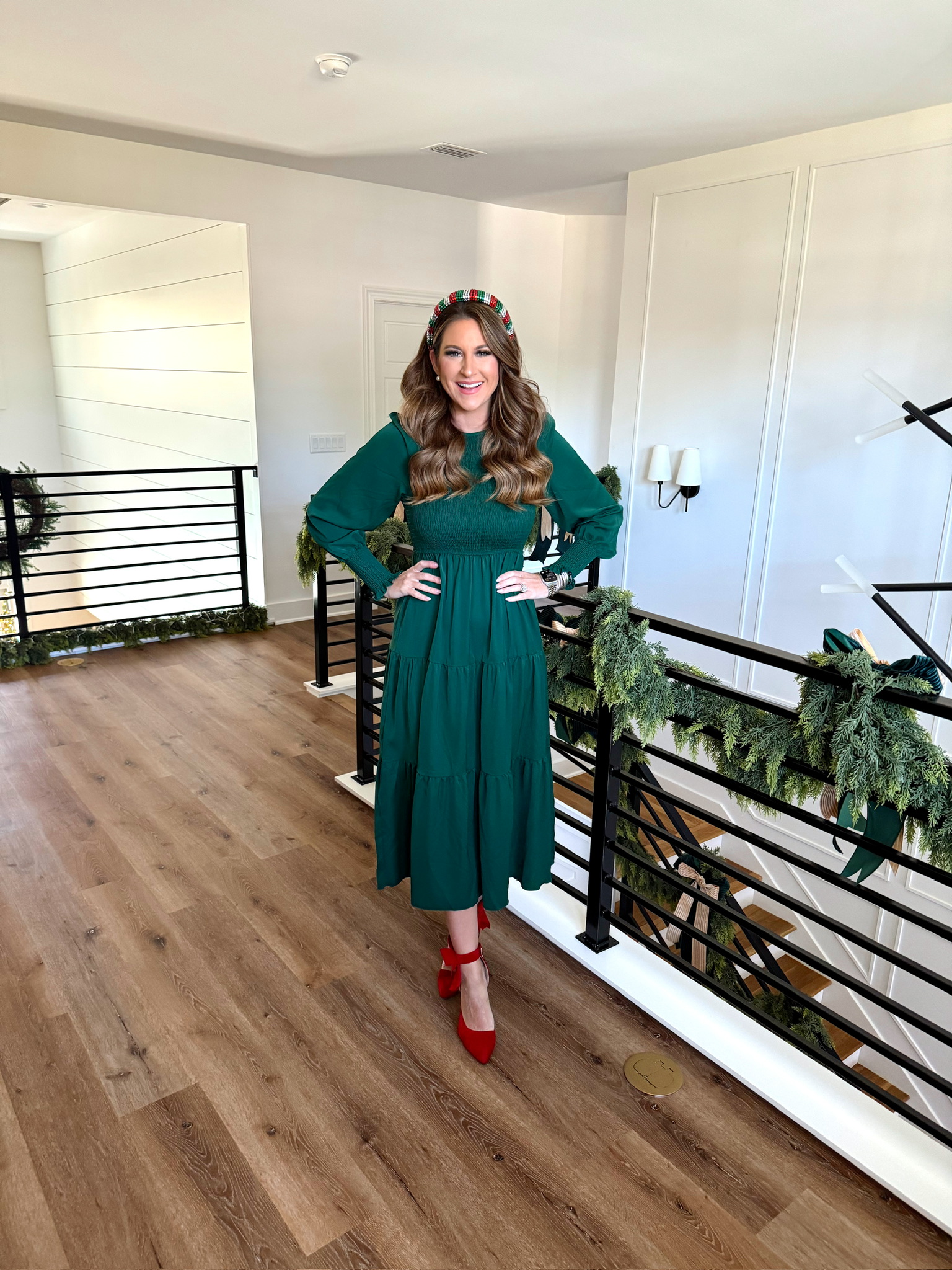 In a medium green midi, red bow heels, rhinestone headaband and accessories for winter/holiday event guest outfit – all fits TTS.