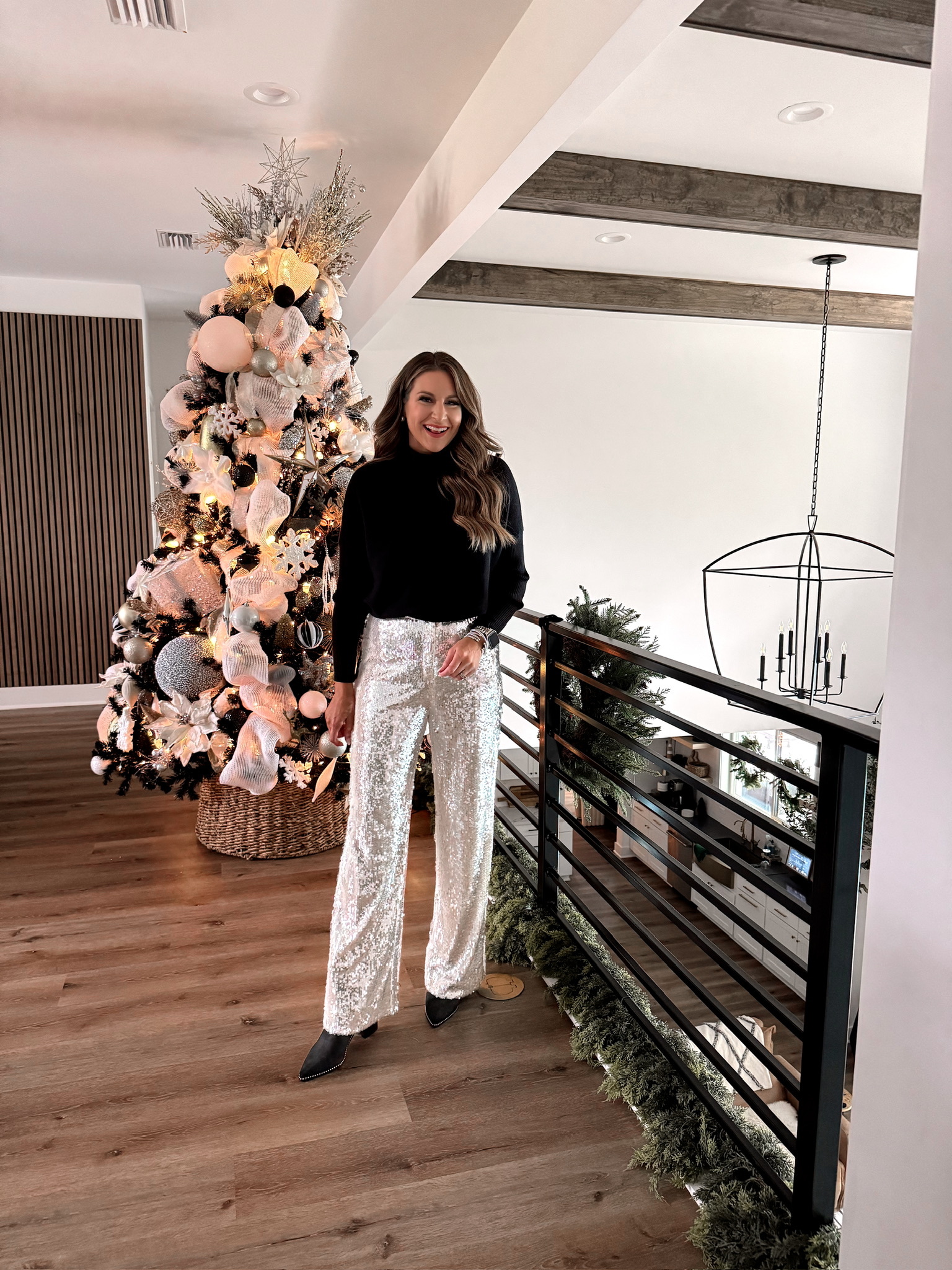In a medium turtleneck oversized black sweater, medium silver sequin pants, boots and accessories for holiday/winter outfit – all fits TTS.