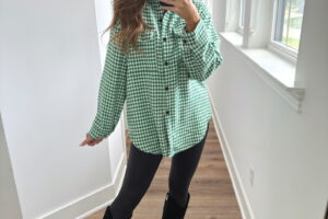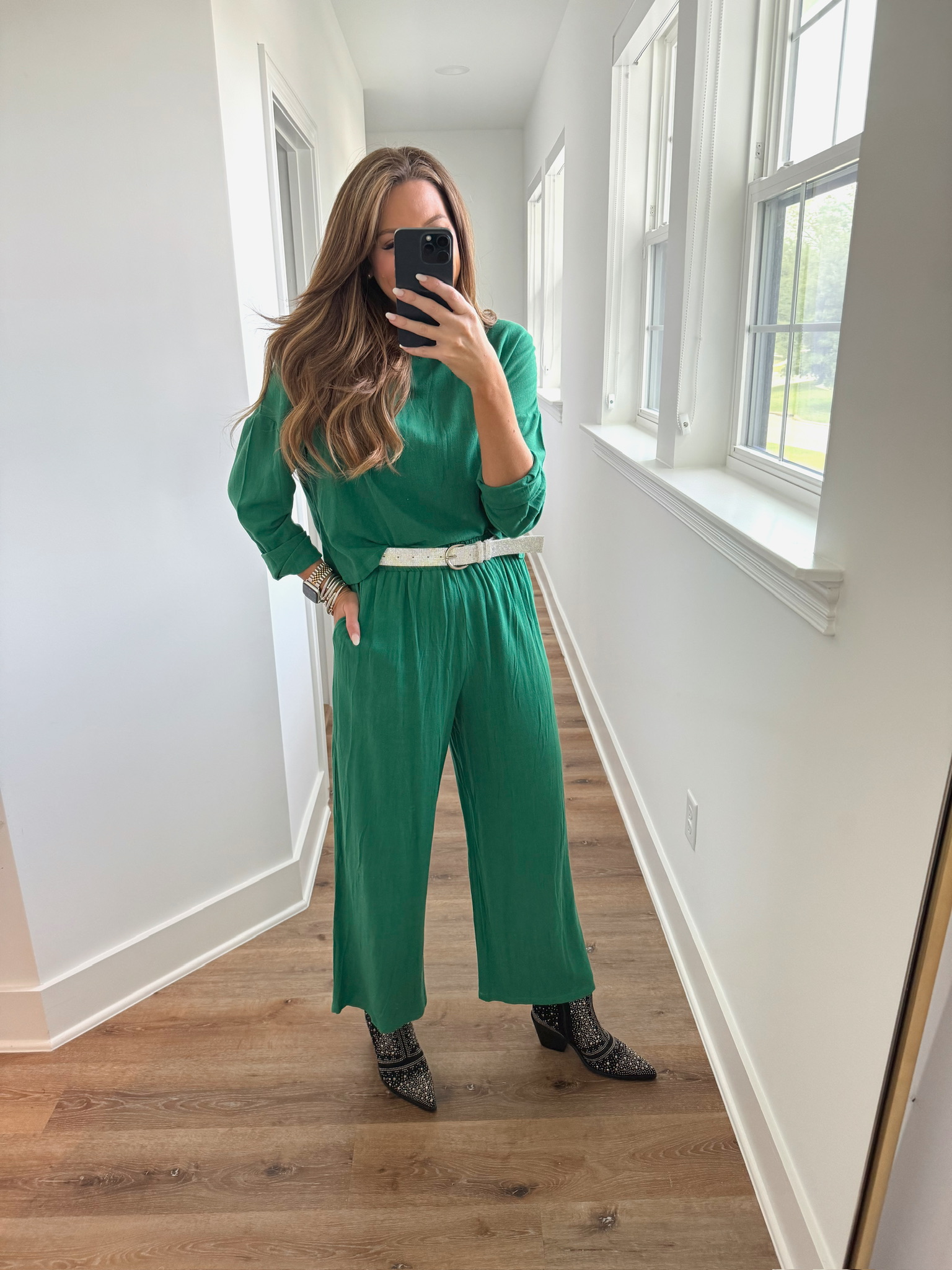 In a medium green 2 piece set with cropped pants and long sleeve top, rhinestone belt, rhinestone ankle boots and accessories for holiday/winter – all fits TTS.